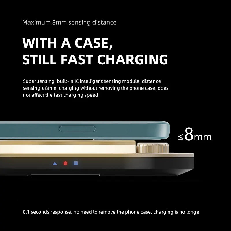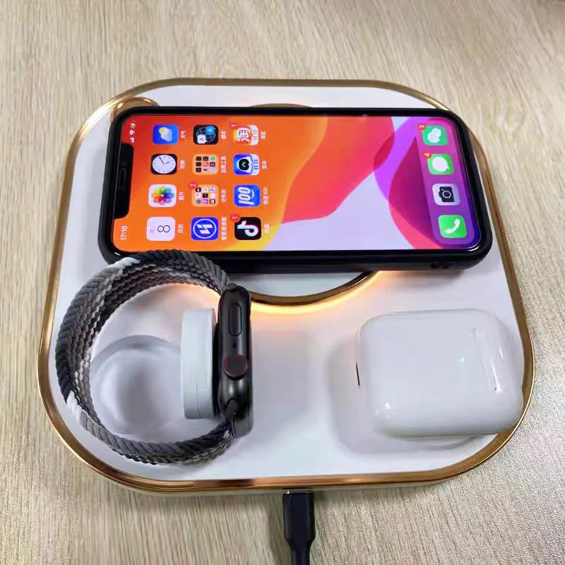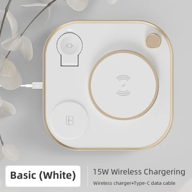 But the real game-changer? Our 15W wireless charging pad. Say goodbye to tangled cords and hello to effortless charging. With the ability to fast-charge your iPhone, Apple Watch, and AirPods simultaneously, staying powered up has never been easier.